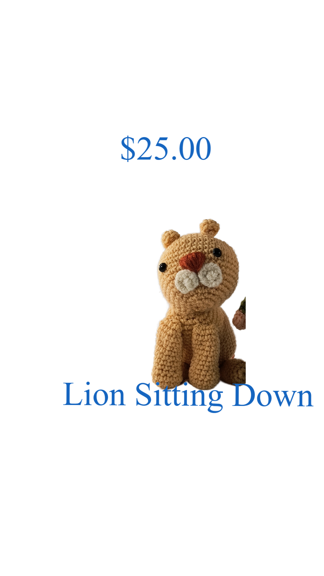 The entire set is made of 100% acrylic yarn, (Daniel), olive green linen, gray, dark brown. the lions are 100% acrylic yarn in the colors, vanilla, rust, orange and white. All figures have black safety eyes. Daniel has plastic canvas and a pellet pouch to assist his standing. The lying down lion measures approximately 11 inches in height, 2 inches in length, 9.5 inches in width. and weighs 2.9 ounces. Sitting lion measures approximately 9 inches in height, 2 inches in length, 11 inches in width, and weighs 3.6 ounces. The standing lion measures approximately 6 inches in height, 2 inches in length, 11 inches in width, and weighs 3.9 ounces.