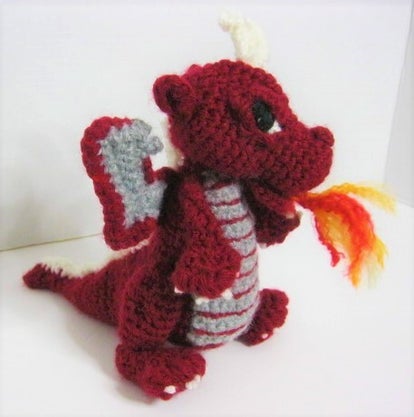 Deek Dragon was designed by Sharon Ojala. He is made of 100% acrylic yarn in gray, burgundy body,arms and legs, green safety eyes and white horns and nails. His wings are gray and burgundy, measure 4.5 inches in length with wires inserted to make them bendable. The tail is gray and burgundy and measures 4.5 inches in length. Deek is stuffed with polyester fiberfill. He measures 6 inches in height, 7 inches in width, 2.5 inches depth and weighs 4 ounces.